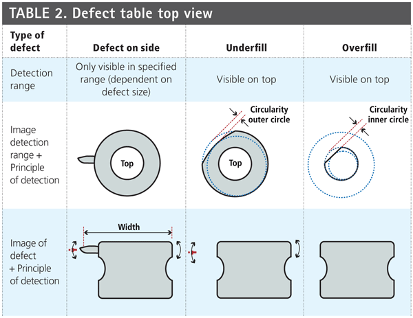 Again, the images are fed into the PC, and the HALCON software performs blob analysis and measurements to identify potential defects and classify the ring. Again, the National Instruments timing card tracks failed rings and triggers the air rejecter as necessary to separate bad parts from good (see Table 2).