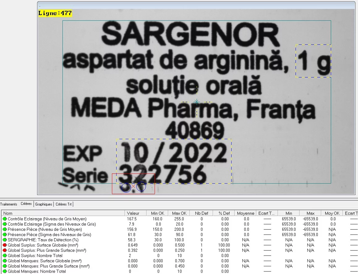 Due to temporary lack of friction, rotation speed of the ampoules is not always the same. With the asynchronous line scan, the visible effects are local distortions, which cannot be foreseen. These distortions are often recognized as errors, but they are not. Thus, the objective is to detect printing errors with the lowest possible number of both false positive and negative reports.