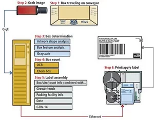 Images from the camera are transferred over a GigE interface to an Intel-based multicore PC. To identify the types of cases, Gaddy used the HALCON 11 vision software package from MVTec Software. For the HALCON software to identify the boxes of produce, the system must first be trained. Images of each type of box to be identified are first captured as they travel through the system, and shape model files are created by analyzing the physical dimensions of the box and artwork printed on it (see Figure). In practice, some boxes require as many as six shape models per box to be captured by the system before one box can be distinguished from another.