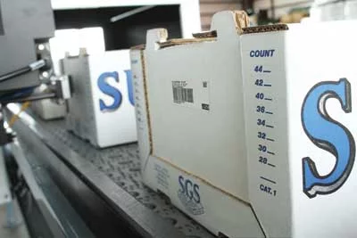 Having identified the case type, size, and number of items of produce, the data are used to create a barcode identifier label. This is transferred over an Ethernet link to a S84 print engine from Sato that prints the barcode label, which is affixed to the case by a 250 label applicator from IDTechnology.