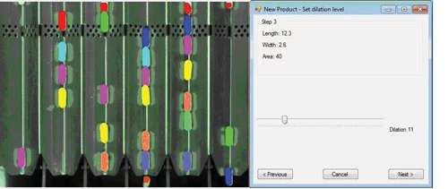 Rather than choose a fixed threshold value, however, the system uses a local adaptive thresholding technique to separate desirable foreground image objects from the background. Individually tuning the threshold values for each lane of feed trays provides a more robust solution to accommodate changes in illumination across the trays. Because many tablets or capsules may be touching as they move down the trays, a means was needed to digitally separate them prior to making measurements on their size and color. To do so, the vision software makes use of erosion and dilation operators found in the HALCON toolset. In use, the erosion operation removes a given number of pixels from around the outer perimeter of the objects identified in the image. If the product has been eroded correctly, touching products are then separated into separate objects. What is more, smaller objects in the image, such as dust, the thin reflections from the grooves in the tray or the small regions due to the reflections of the product in the sides of the grooves in the trays disappear.