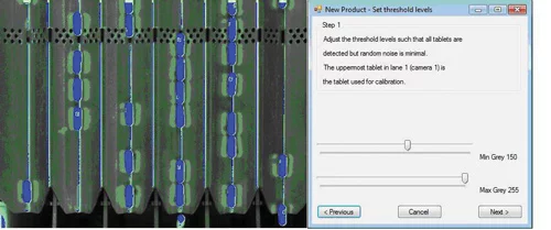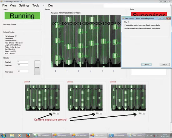 Next, the images are dilated to their original size by adding pixels around their edges. The vision system can then perform measurements to determine their width, length and area. In some instances, capsules may have a pharmaceutical manufacturer's logo printed onto them. If the printed logo is on the very perimeter of the tablet when an image of the tablet is captured by the camera, the capsule may appear to have an occlusion on one side. Hence measuring the width of the tablet would be compromised. To overcome this issue, a HALCON convex hull operation is performed on the images of a tablet to eliminate the impact of concaved areas in the image, enabling an accurate measurement of its width to be made. Setup and training Prior to use, the vision system fitted to the counting and bottling machine must be taught the characteristics of a new product. To do so, an operator allocates a name to the product on an HMI and places the new tablets or capsules to be inspected over each track of the trays. The camera aperture or exposure time of each of the cameras can then be modified to ensure that the tablets can be appropriately imaged by the system (Figure 2).