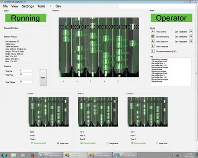 As the tablet leaves the tray and gets counted into a bottle, the vision system outputs the tablet inspection result. The tablet must be deemed 'good' in at least one image, otherwise it is 'bad' and the bottle it goes into automatically gets segregated to a reject area. As the system inspects the tablets or capsules, an operator can immediately visualize the total number of tablets inspected by the machine on the HMI, as well as the total number that have passed or failed the inspection (Figure 5). Looking ahead Although the machines described above are the standard Pharma Packaging Systems' machines retrofitted with machine vision, the latest machine jointly developed by Pharma Packaging Systems and Machine Vision Technology also ensures that only good product is discharged for further processing. In the new design, products are transferred from a vibratory system onto a flat belt where they are inspected by the vision system for width, length, area and color. Should the vision system detect any products that do not fall within specification, it triggers a series of electromechanical reject chutes positioned at the end of the belt into which the faulty products are dropped. The new system-which was recently installed at a large UK tablet manufacturer-can inspect up to 10,000 tablets per minute. The products used in the design of the system were supplied and supported by Multipix Imaging (Petersfield, England; www.multipix.com).