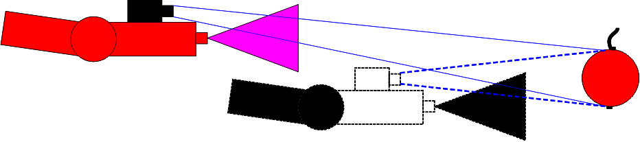 To pick one apple, the robot has to determine the distance between the camera and the apple and the path to get there. The camera measures this distance by triangulation. The measuring is done in several steps. The camera first acquires an image, and then the camera is turned so that the apple is situated in the center (see Fig. 6). The camera then acquires a second image, and finally the diameter is calculated by processing these two images. At this point, the vision system determines if the apple falls within the acceptable size range. If so, a signal is sent across a Profibus connection to the robot controller, and the robot arm is allowed to continue toward the apple.