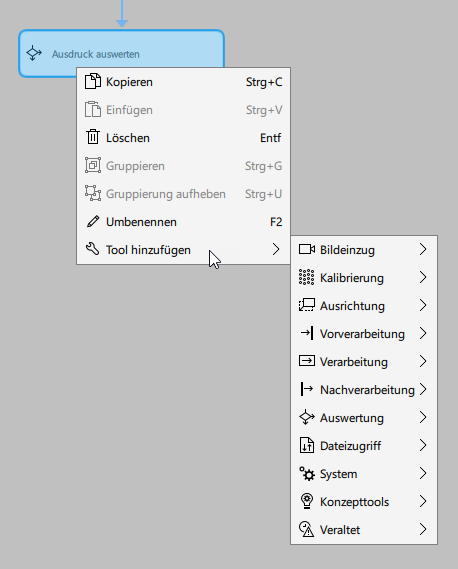 In einigen Fällen ist es u. U. schneller, ein Tool oder mehrere Tools im Tool-Flow-Panel zu kopieren, anstatt sie von Grund auf neu zu erstellen. Es ist auch möglich, Tools aus einer MERLIC-Instanz in eine andere MERLIC-Instanz zu kopieren, wenn Sie die gleichen Tools in einer neuen oder anderen MVApp verwenden möchten. Sie können ein Tool im Tool-Flow-Panel über das Kontextmenü oder mit Tastenkombinationen kopieren.
