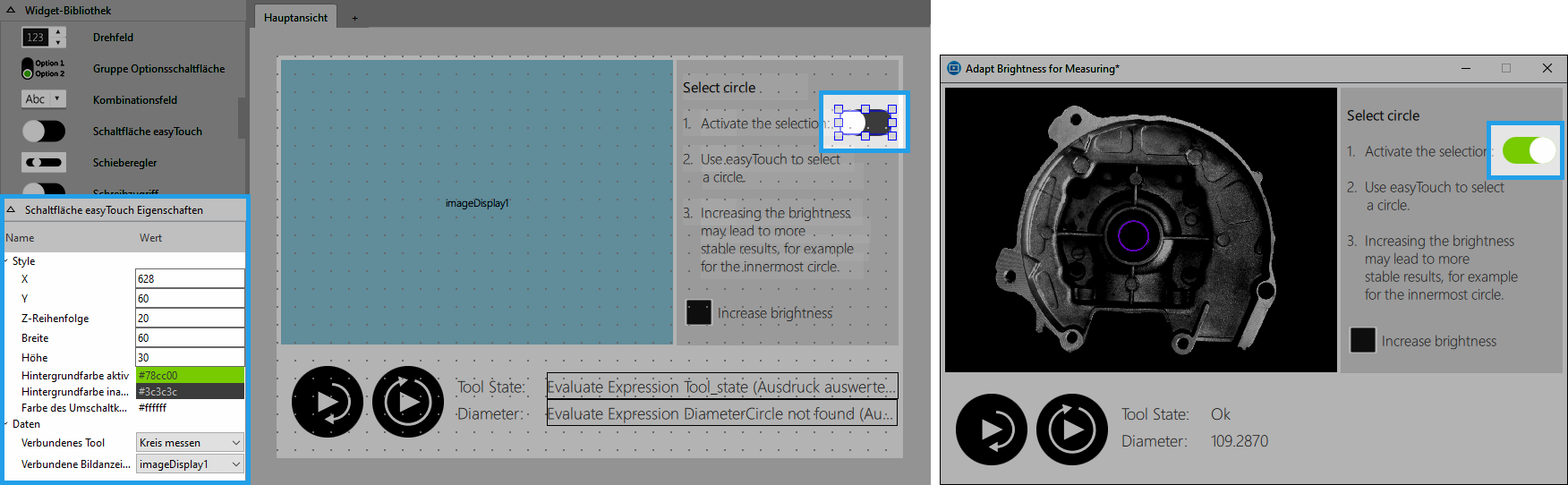 Über die „Schaltfläche easyTouch“ können Sie das Bild im Widget „Bildanzeige“ mit der easyTouch-Funktion des verbundenen Tools verknüpfen. Sie können die Funktion easyTouch über den Schieberegler der Schaltfläche aktivieren und deaktivieren.
