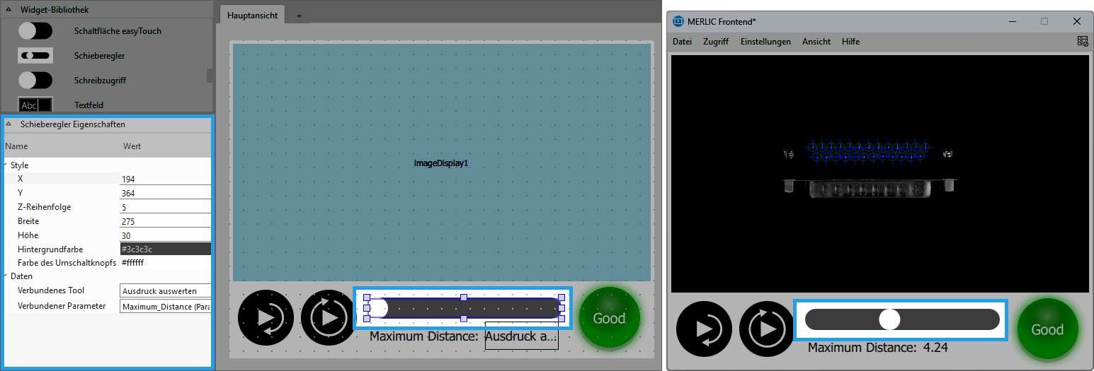 Dieses Widget stellt einen Schieberegler im Frontend dar, mit dem der Wert eines verbundenen Parameters Ihrer MERLIC-Vision-App angepasst werden kann.