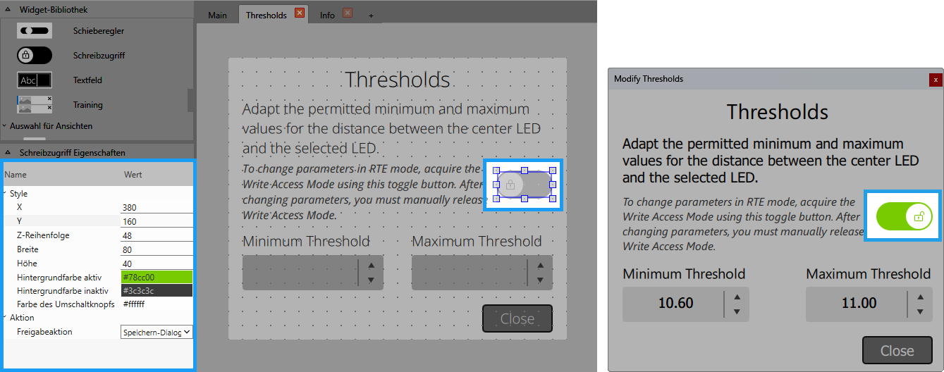 Mit diesem Widget können Sie den Schreibzugriff im MERLIC Frontend steuern, wenn Sie MERLIC im Runtime Environment-Modus (MERLIC RTE) verwenden.