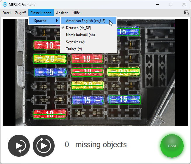 Eine Voraussetzung zum Ändern der Sprache ist, dass die Spracheinstellungen für das MERLIC Frontend beim Entwurf des Frontends der MERLIC-Vision-App entsprechend angepasst wurden. Diese Spracheinstellungen bieten auch die Möglichkeit, die Standardsprache zu ändern, in der das MERLIC Frontend geöffnet wird. Die Standardsprache gilt für alle MERLIC Frontends (auch wenn sie über eine Remote-Verbindung geöffnet wurden), d. h., die Standardsprache ist unabhängig von den Anwendungen. Die festgelegte Standardsprache wird also in den MERLIC-Einstellungen gespeichert und nicht in der MERLIC-Vision-App.