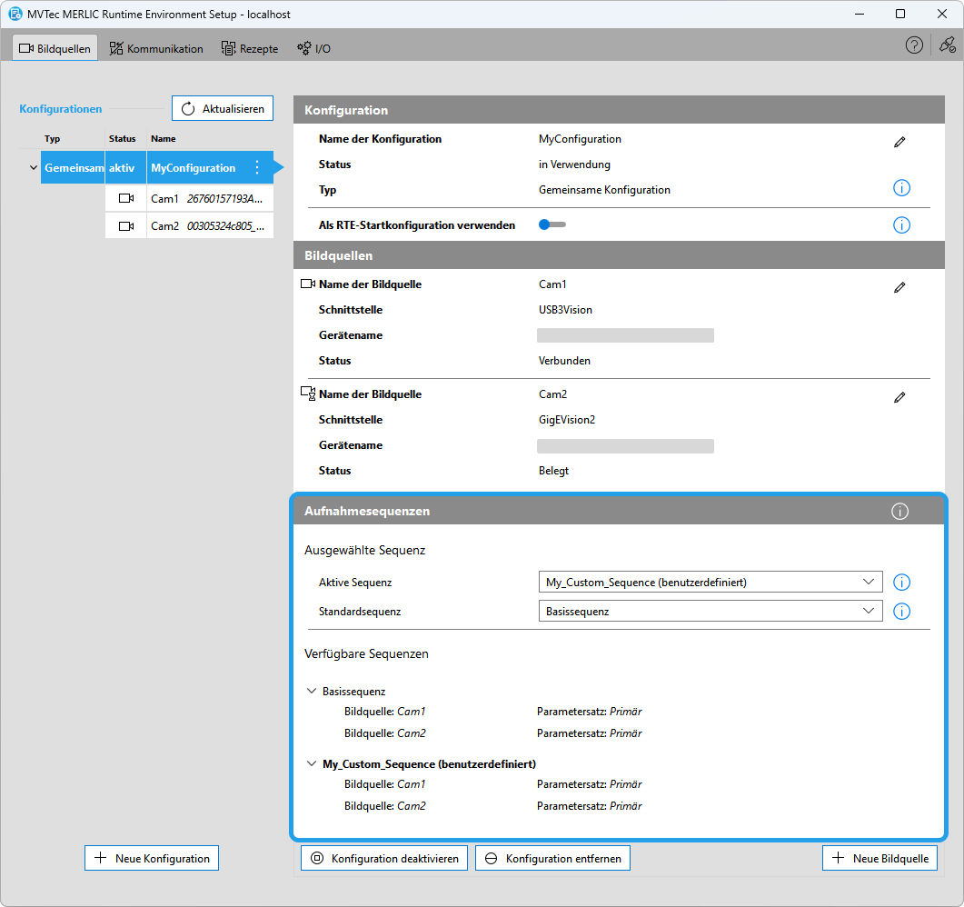 5. Ihre benutzerdefinierte Aufnahmesequenz wird nun in der Übersicht für die jeweilige Bildquellen-Konfiguration angezeigt. Wählen Sie bei Bedarf eine Standardsequenz für Ihre Bildquellen-Konfiguration aus, wie unter Aufnahmesequenzen anzeigen und aktivieren beschrieben.