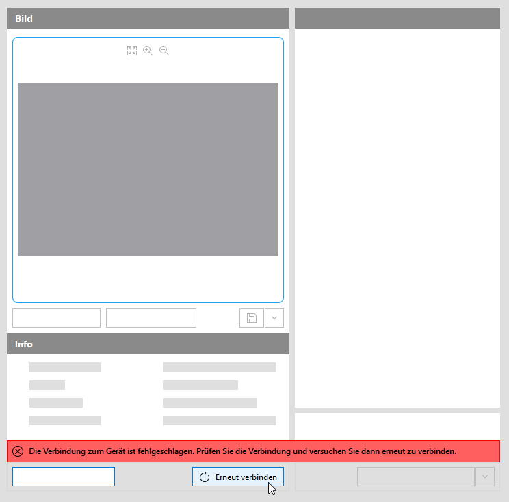 In einigen Fällen kann es sein, dass die Verbindung zum Kameragerät getrennt wurde, sodass die Kameraparameter nicht verfügbar sind und keine Bilder eingezogen werden können. Stattdessen wird ein Fehlerbild angezeigt. In diesem Fall können Sie versuchen, die Verbindung zur Kamera über die Schaltfläche „Erneut verbinden“ unten in der Bildvorschau wiederherzustellen.
