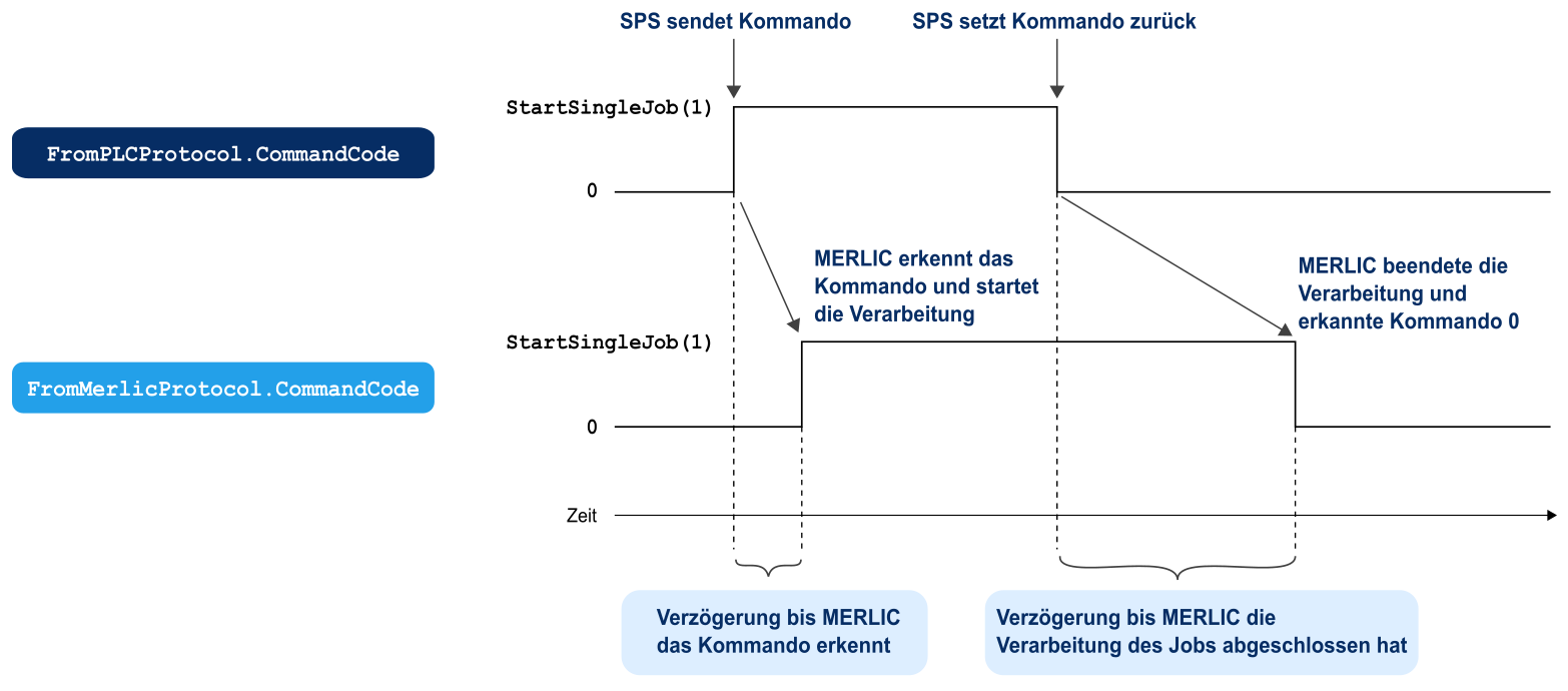 Die folgende Grafik veranschaulicht den Handshake-Prozess für den Befehl „StartSingleJob“. Die SPS löst eine Einzelausführung aus, indem „CommandCode“ im Protokoll „FromPLCProtocol“ auf 1 gesetzt wird. Nachdem MERLIC den Befehl erkannt hat, wird das Element „CommandCode“ im Protokoll „FromMerlicProtocol“ als Bestätigung für die SPS ebenfalls auf 1 gesetzt. MERLIC startet daraufhin die Ausführung der MVApp in einer Einzeliteration. Sobald die SPS die Bestätigung von MERLIC erhält, dass der Befehl erkannt wurde, wird das Element „CommandCode“ in FromPLCProtocol auf 0 gesetzt, um den Handshake-Prozess zu beenden. Nachdem die Einzeliteration der MVApp beendet wurde, ermittelt MERLIC, welcher CommandCode von der SPS gesendet wurde, und die entsprechenden Aktionen werden durchgeführt.