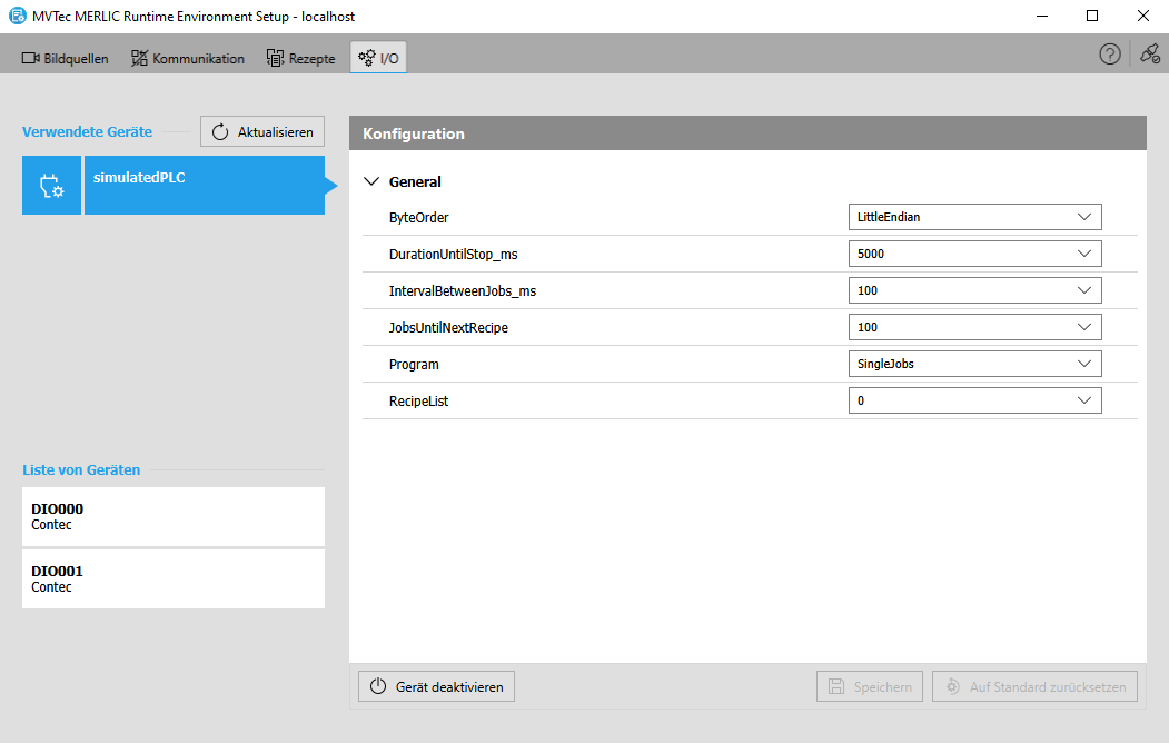 MERLIC stellt ein Plugin zur Verfügung, das eine Verbindung zu einer simulierten SPS als virtuelles Gerät herstellt. Dabei wird das gleiche Kommunikationsprotokoll wie für eine Hilscher card verwendet. Dieses virtuelle Gerät kann für hardwareunabhängige Kommunikationssimulationen verwendet werden. Die simulierte SPS kann auf der Registerkarte „ I/O“ des MERLIC RTE Setups für die Ausführung eines von zwei vordefinierten Programmen konfiguriert werden. Beide Programme können optional eine Liste von Rezepten Eine MERLIC-Rezeptdatei ist ein wesentlicher Bestandteil der MERLIC-Prozessintegration. Dabei handelt es sich um eine separate Datei (mit der Dateiendung .mrcp), die definiert, welche MERLIC-Vision-App für die Prozessintegration geladen wird. Sie definiert außerdem, wie die MVApp parametrisiert wird, da sie mehrere vordefinierte Eingabewerte für ausgewählte Toolparameter enthält.