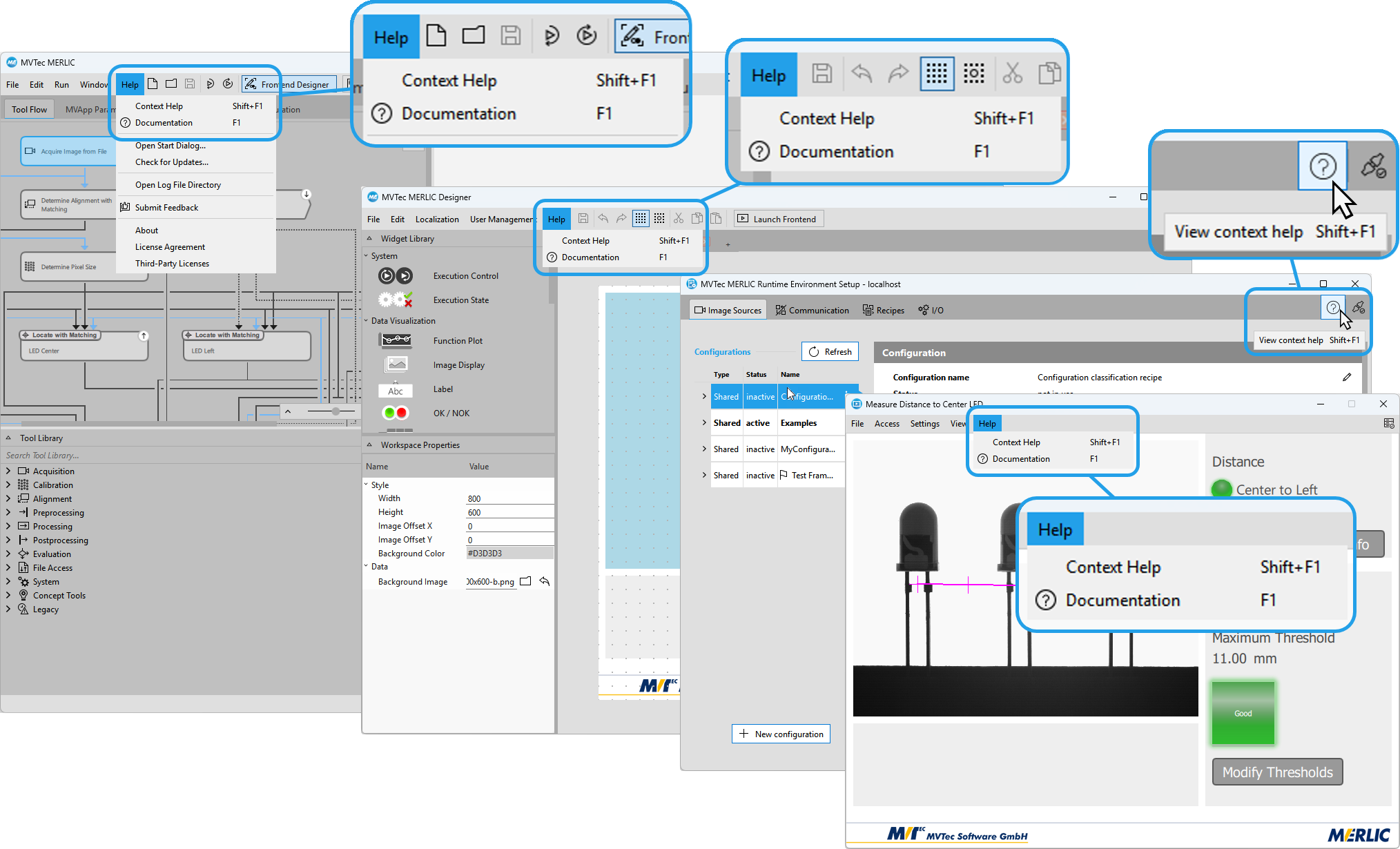 The usability of the help menus has been enhanced to provide more intuitive access to documentation. The "Help" menus in all components now provides menu entries to access context sensitive help and the start page of the MERLIC manual. In addition, the respective keyboard shortcuts are now also clearly indicated. The MERLIC RTE Setup has been extended by a new help button on the top-right corner. In addition to the keyboard shortcut, you can now also use the help button to open the context help for the respective tab in the MERLIC RTE Setup.