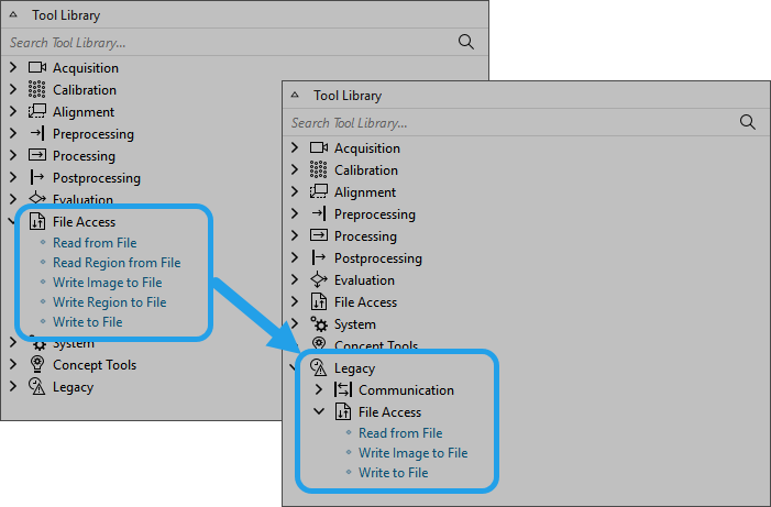 Starting with this MERLIC version, the MERLIC tools "Read from File", "Write Image to File", and "Write to File" are now set as legacy. They have been moved to the tool category "Legacy > File Access". The tools are still available to provide backward compatibility but they will no longer be maintained or updated in upcoming MERLIC. We recommend using the communication plug-ins "save-results" and "save-images" instead.