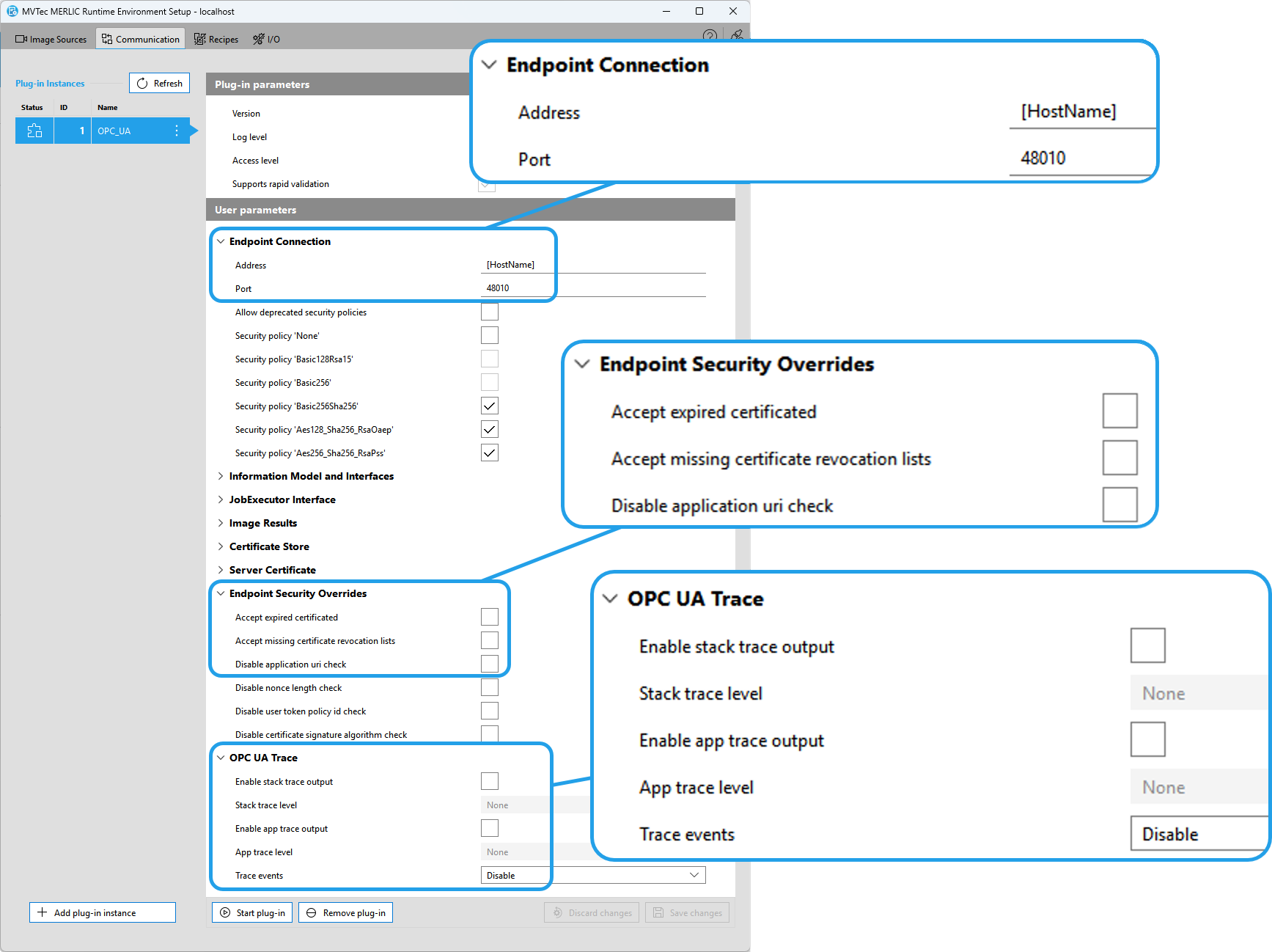 The plug-in now redirects the "trace" information from the stack and application directly into the MERLIC RTE log files removing the need of a separate log file. The plug-in configuration in the category "OPC UA Trace Settings" has been adjusted accordingly.