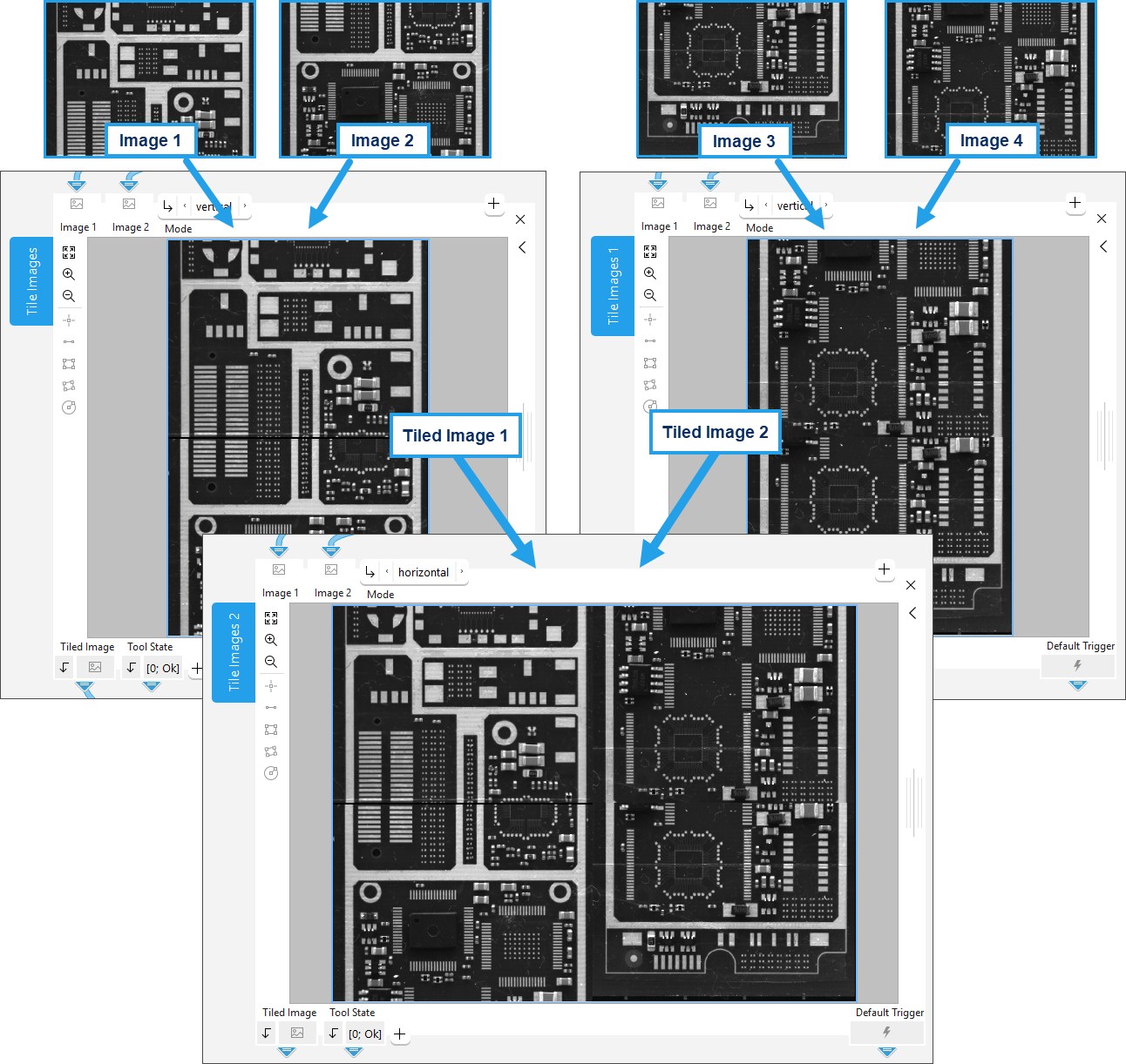 MERLIC has been extended by a new concept tool "Tile Images". It enables you to tile two images containing the same number of channels into one image. The images can be tiled either horizontally or vertically. If desired, you can use the tool multiple times to subsequently create an image based on a sequence of tiled images. In combination with acquisition sequences, this enables you to combine images that were acquired from a line scan or area camera.
