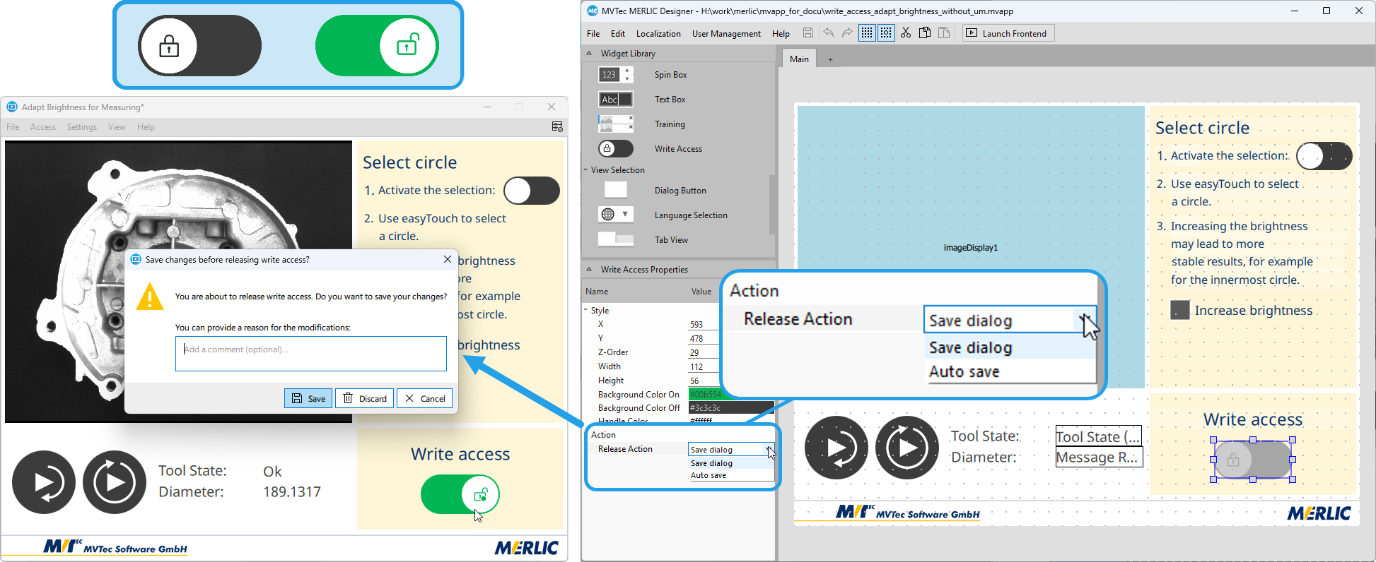 The configuration options for the "Write Access" widget have also been extended. When creating the Frontend design for an MVApp, it is now possible to choose a so called release action, which will be triggered when releasing the Frontend write access while there are still unsaved changes. You may choose between saving the changes automatically or showing a save dialog, which allows Frontend users to discard the changes or to specify a reason for the changes. In combination with the user management, this also allows configuring multiple "Write Access" widgets with different release actions, for example, on different views for users with different authorization rights.