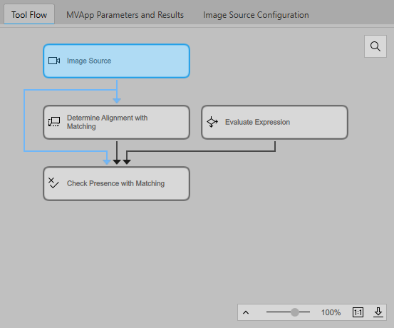 Three tools of the Tool Flow are selected in the Tool Flow panel. The tool Determine Alignment with Matching is the focus tool The focus tool is the editable tool shown in the Tool Workspace. It also serves as reference position when several tools are moved within the Tool Flow panel., thus it is in focus and is displayed in the Tool Workspace.