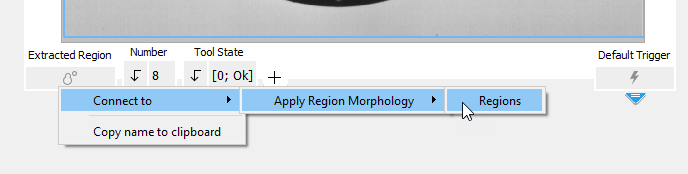 The data connections between an image parameter and an image result from a previous tool in the Tool Flow are created automatically whenever a tool is inserted but not when a copied tool is pasted. MERLIC checks whether a result of a previous tool represents an image and if the inserted tool contains an image connector. If this is the case, the image result of the previous tool is connected automatically to the image connector of the inserted tool.