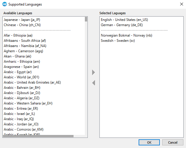 - Click on the Designer menu entry "Localization" and select "Select Languages..." to open the dialog of supported languages. On the left of the dialog, the list of available languages is displayed. It comprises a wide variety of languages including country specific language variations. On the right, the list of languages is displayed that will be available in the Frontend.