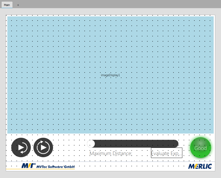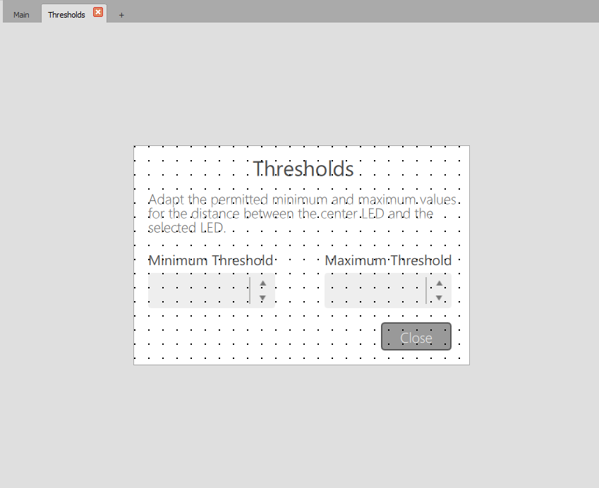 This is the view that is displayed by default when opening the Frontend. Beside several other widgets the Dialog Button widget is used. It is defined with the text "Modify Threshold" and enables the user to open a dialog window. The design of this dialog must be defined in another view, i.e., in the view tab "Thresholds".
