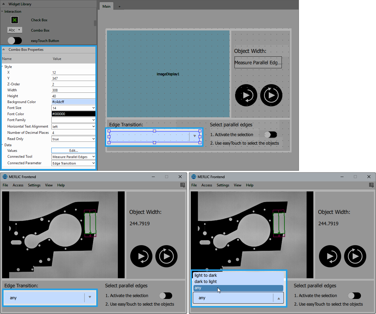This widget allows you to use a combo box in your Frontend. It can be connected to a tool parameter of your MERLIC Vision App to display the value list of the respective parameter. This enables you to set the value of a connected parameter directly in the Frontend.