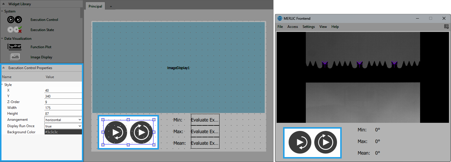 This widget allows you to control the execution of your application, i.e., to start and stop the execution of your MERLIC Vision App. By default also the "Run Once" button for single execution steps is enabled. If you only want to provide the continuous execution of the application, you can adjust the settings at the property "Display Run Once".