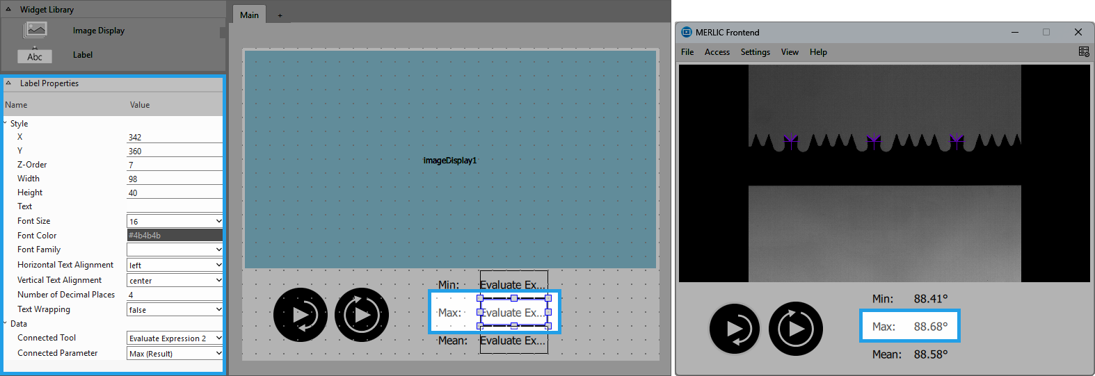 Connect to a tool from your MERLIC Vision App by selecting the desired tool from the drop-down menu. You can only select tools that are used in your MERLIC Vision App. At the property "Connected Parameter" you may then select the parameter whose value you want to display in the widget.