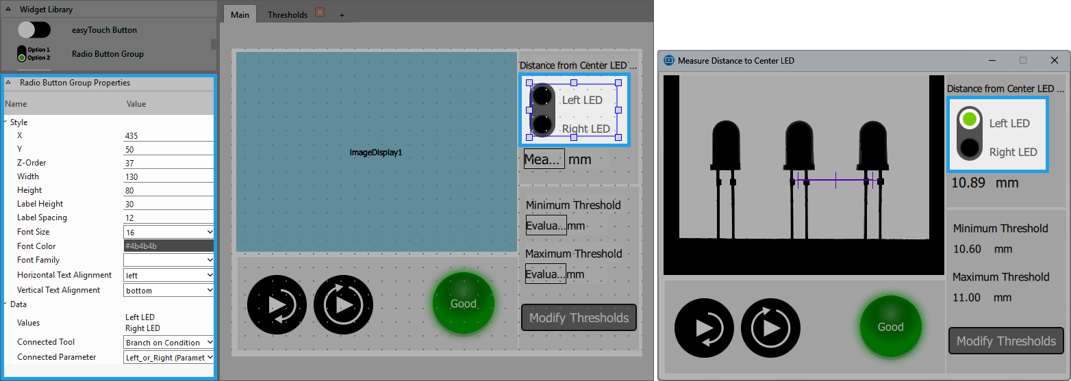 This widget can be used as a group element to set parameter values via radio buttons in the Frontend. You can either connect the widget to the value of a parameter of your MERLIC Vision App or define a customized value list to be displayed.