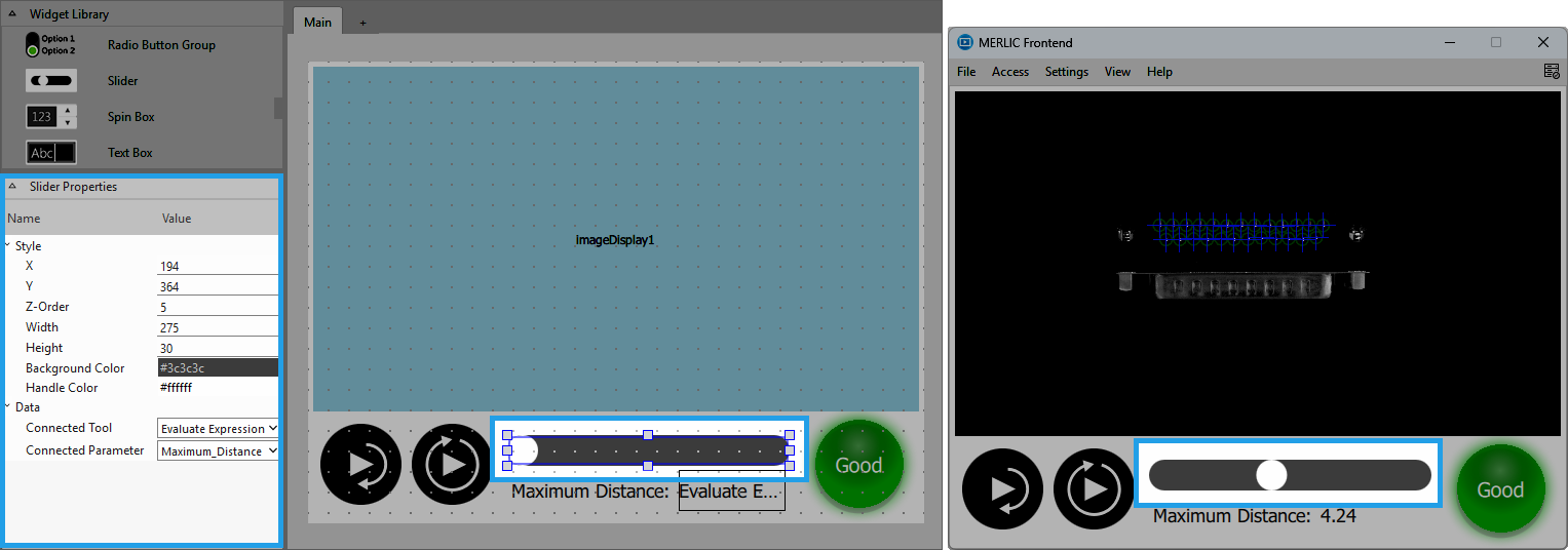Connect to a tool from your MERLIC Vision App by selecting the desired tool from the drop-down menu. You can only select tools that are used in your MERLIC Vision App. At the property Connected Parameter you may then select the parameter whose value you want to adjust with the slider.