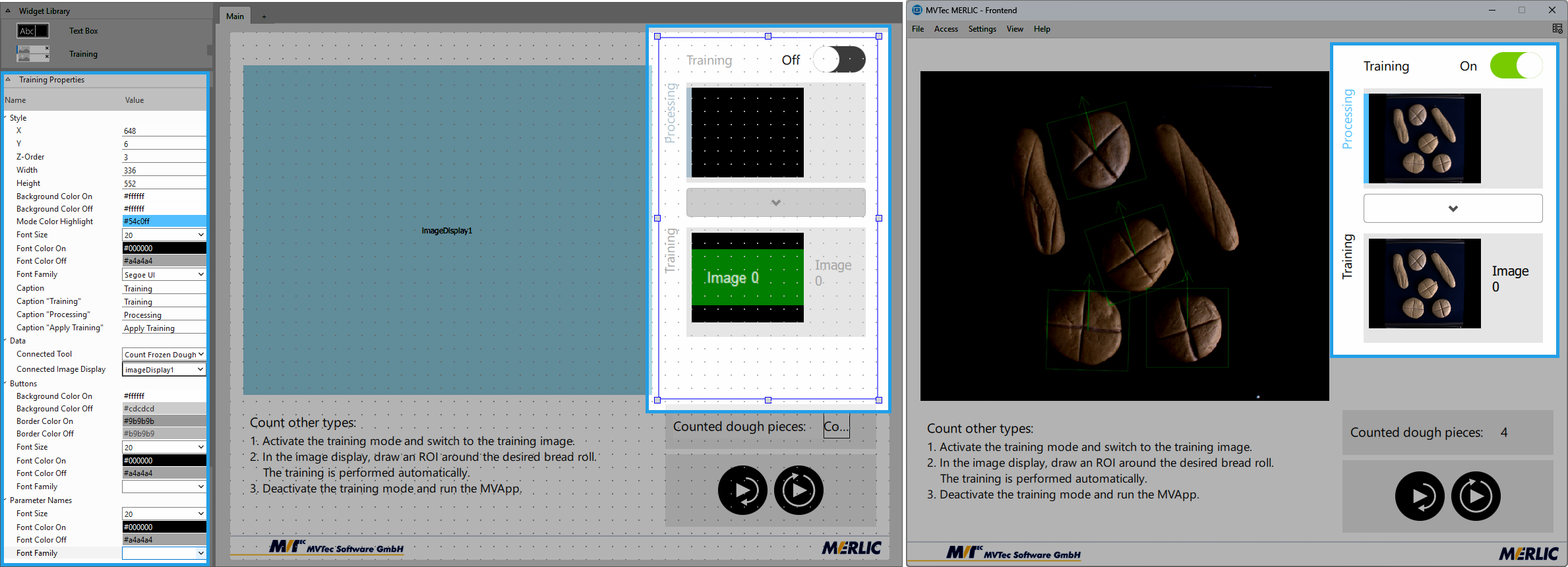 The training is implemented individually for each tool with a training mode. When using the "Training" widget in the MERLIC Frontend, you can activate the training mode by sliding the handle of the "Training Switch". The widget will then offer you the same training functionality as in the MERLIC Creator. Thus, the appearance and usage of the training depends on the connected tool. For the visualization of the respective training images, an "Image Display" widget is required. It must be connected in the properties of the "Training" widget.