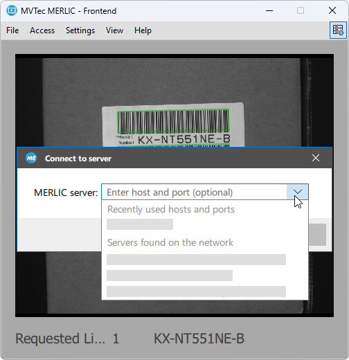 To enable a remote connection, you need to specify the MERLIC server to which the Frontend should connect to, that is, the hostname or IP address of the MERLIC server and the port to be used. A MERLIC server is part of the MERLIC core The processing unit of a running MERLIC Vision App. that was started on a host machine.