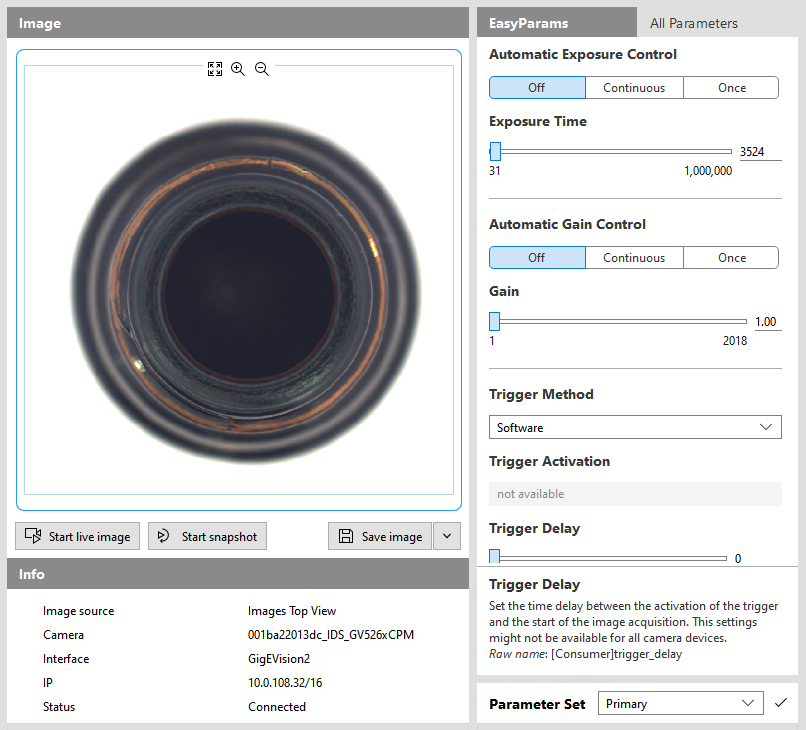 The respective details of the selected camera device will be loaded and shown on the right of the image source list. You can then use the image preview area to check the settings of the camera parameters that are provided in the "Parameters" sections in real time and to save snapshots of your camera on your system. In addition, you can look up further information on the camera device in the "Info" area below the image preview.