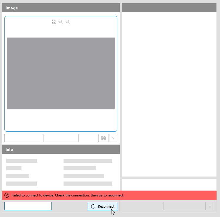 In some cases, the camera device might not be connected anymore and therefore the camera parameters are not available and no images can be acquired. Instead, an error image is shown. In this case, you can try to reconnect to the camera with the button "Reconnect" on the bottom of the image preview.