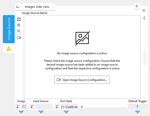 In the following example image, no image source configuration is active. Therefore, no image could be acquired from the selected image source. In this case, a message is displayed on the Tool Board indicating the cause of the problem. In addition, a warning is reported for the tool indicated by the warning icon and the value of the "Tool State" result. To fix such a problem, you can open the image source configuration using the button provided in the Tool Board, check the configuration of your image sources, and make the required adjustments.