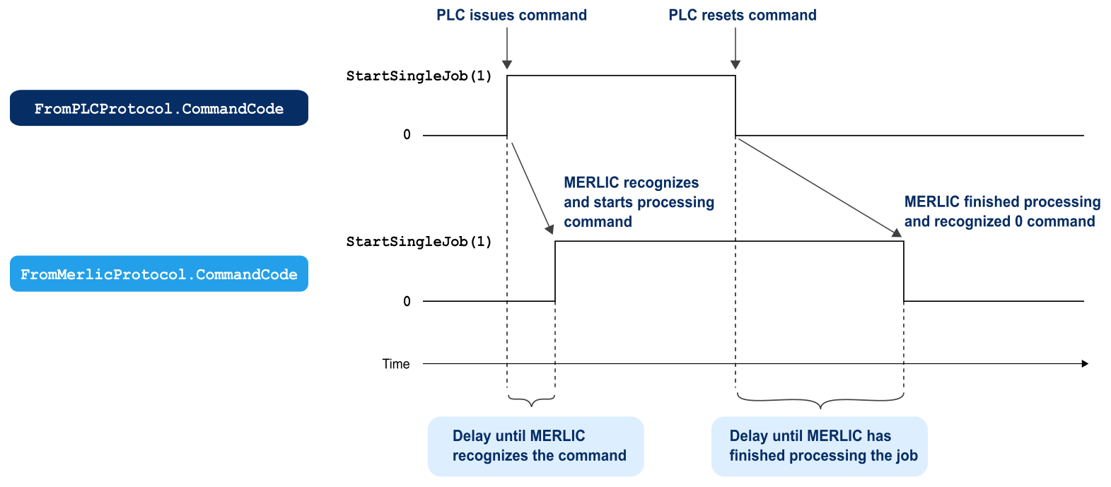 The following graphic shows the handshaking process for the command "StartSingleJob". The PLC triggers a single execution by setting CommandCode in the protocol FromPLCProtocol to 1. When MERLIC recognized the command, the CommandCode member in the protocol FromMerlicProtocol is also set to 1 as confirmation for the PLC, and MERLIC starts to execute the MVApp in a single iteration. As soon as the PLC receives the confirmation from MERLIC that the command was recognized, the CommandCode member in FromPLCProtocol is set to 0 to finalize the handshaking process. After finishing the single iteration of the MVApp, MERLIC checks which CommandCode is sent from the PLC and proceeds accordingly.