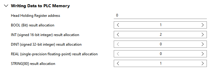 This parameter defines the number of Boolean results that can be transmitted to the PLC. For example, if you want to transmit up to five Boolean results, set the parameter to 5 or higher.