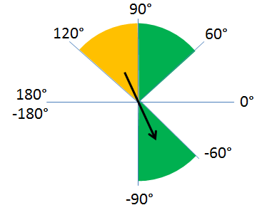 The regions are evaluated based on their orientation. The determined orientation that is returned in the result "Feature Values" is given in a range between −90° and 90° since the regions can also be selected by their corresponding angle in the opposite quadrant. E.g., if "Minimum Feature Value" is set to 60° and "Maximum Feature Value" is set to 120°, all regions with an orientation between 60° to 90° and −90° to −60° are classified as accepted. This is the case because for the range from 90 to 120 the corresponding angles in the opposite quadrant range from −90 to −60.