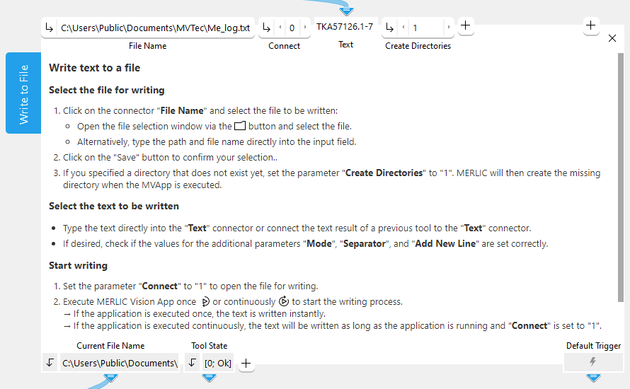 Enter the path and file name at the parameter "File Name". The file will be created and opened by the MVApp if the connector "Connect" is set to 1 and the MVApp is executed. As long as the file is opened by the MVApp it can not be used by another process. If "Connect" is set to 1, the write operation is applied for each execution of the MVApp. Use the button for executing MERLIC once to execute this tool in single steps. This gives you the possibility to write the text step by step. You can close the file by setting the connector "Connect" to 0.