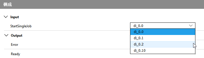 下の構成例では、「StartSingleJob」用の信号が入力チャンネル「di_0.0」を通じて転送されます。