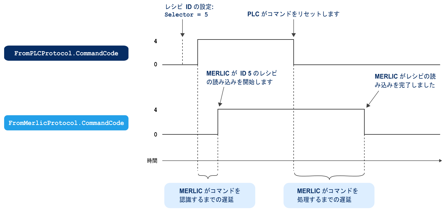MERLIC がコマンドを認識すると、PLC のための確認としてプロトコル FromMerlicProtocol のメンバー CommandCode も 4 に設定され、MERLIC が指定されたレシピ ID のレシピファイルおよび、レシピで参照されている MVApp の読み込みを開始します。PLC が MERLIC からコマンド認識の確認を受信すると、FromPLCProtocol のメンバー CommandCode が 0 に設定され、ハンドシェイクプロセスが完了します。レシピの読み込み後、MERLIC が PLC から送信された CommandCode を確認し、それに基づいて処理を続けます。