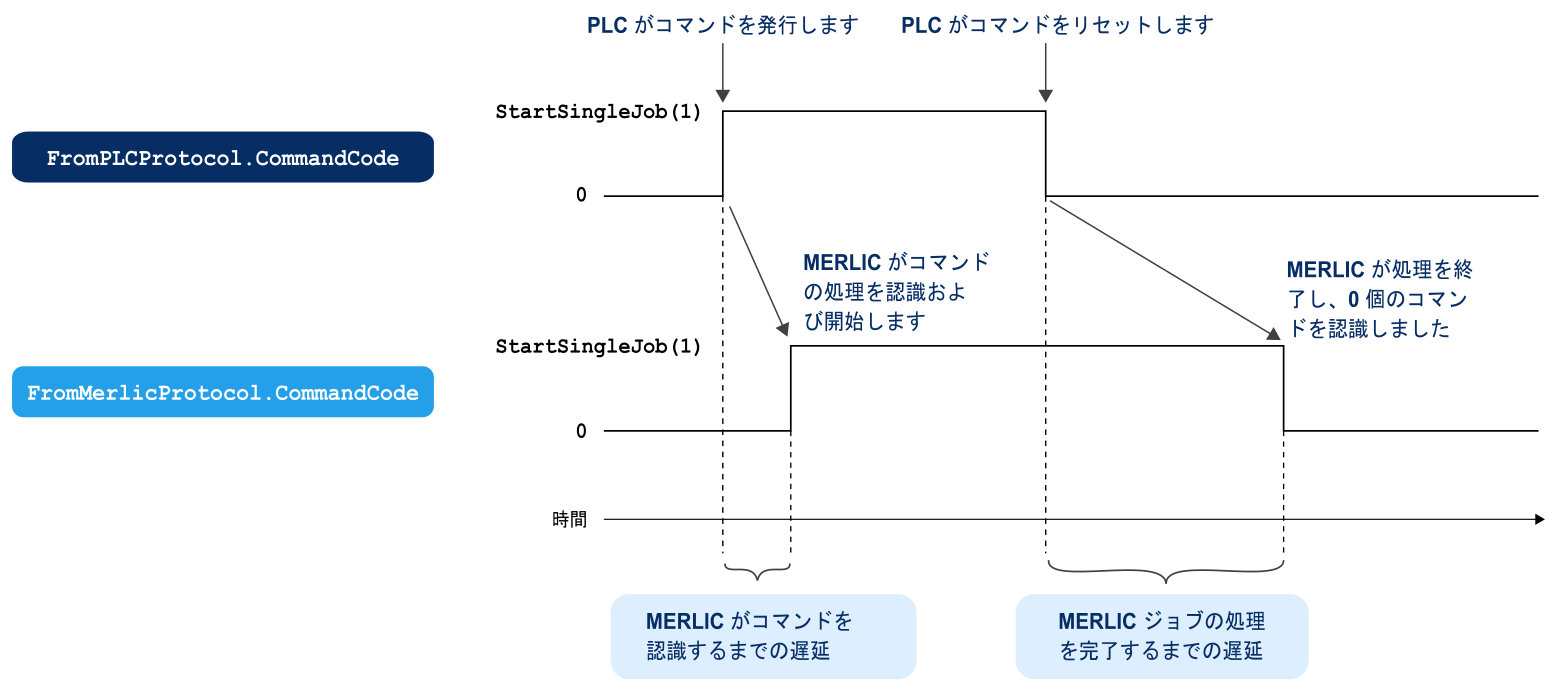 下の図は、コマンド「StartSingleJob」のハンドシェイクプロセスを示します。プロトコル FromPLCProtocol で CommandCode を 1 に設定することで、PLC が 1 回の実行をトリガーします。MERLIC がコマンドを認識すると、PLC のための確認としてプロトコル FromMerlicProtocol のメンバー CommandCode も 1 に設定され、MERLIC が 1 回の反復で MVApp を実行します。PLC が MERLIC からコマンド認識の確認を受信すると、FromPLCProtocol のメンバー CommandCode が 0 に設定され、ハンドシェイクプロセスが完了します。MVApp の 1 回の反復の完了後、MERLIC が PLC から送信された CommandCode を確認し、それに基づいて処理を続けます。
