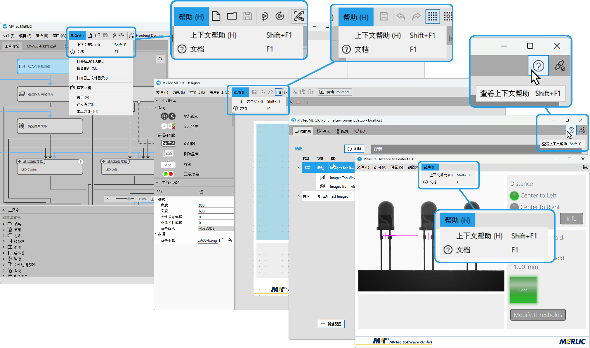 帮助菜单的可用性得到了提升,以便更直观地访问文档。所有组件中的“帮助”菜单现在都提供了菜单项,用于访问上下文相关帮助和 MERLIC 手册的起始页。此外,相应的键盘快捷键现在也已清晰标明。MERLIC RTE Setup 已扩展,在右上角新增了一个帮助按钮。除了键盘快捷键外,您现在还可以使用帮助按钮打开 MERLIC RTE Setup 中相应选项卡的上下文帮助。