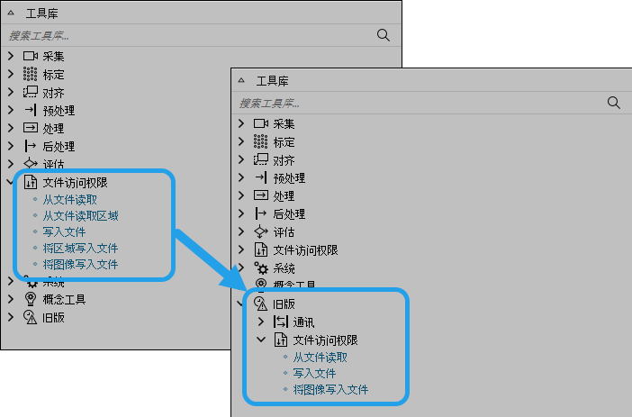 从此 MERLIC 版本开始,MERLIC 工具“从文件读取”、“将图像写入文件”和“写入文件”已被设置为旧版。它们已被移至工具类别“旧版 > 文件访问权限”。这些工具仍可向后兼容,但在即将发布的 MERLIC 中不再获得维护或更新。我们建议改用通讯插件“save-results”和“save-images”。