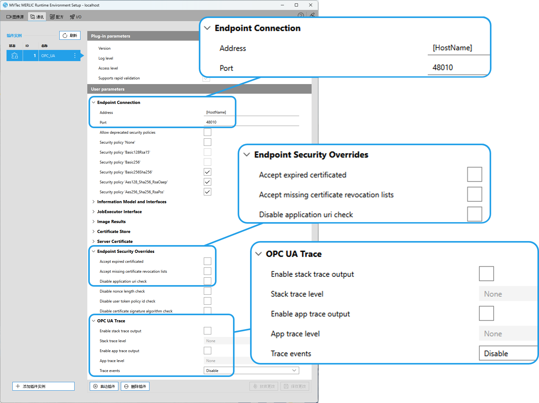 该插件现在将堆栈和应用程序中的“trace”信息直接重定向到 MERLIC RTE 日志文件中,从而无需单独的日志文件。“OPC UA Trace Settings”类别中的插件配置已相应调整。