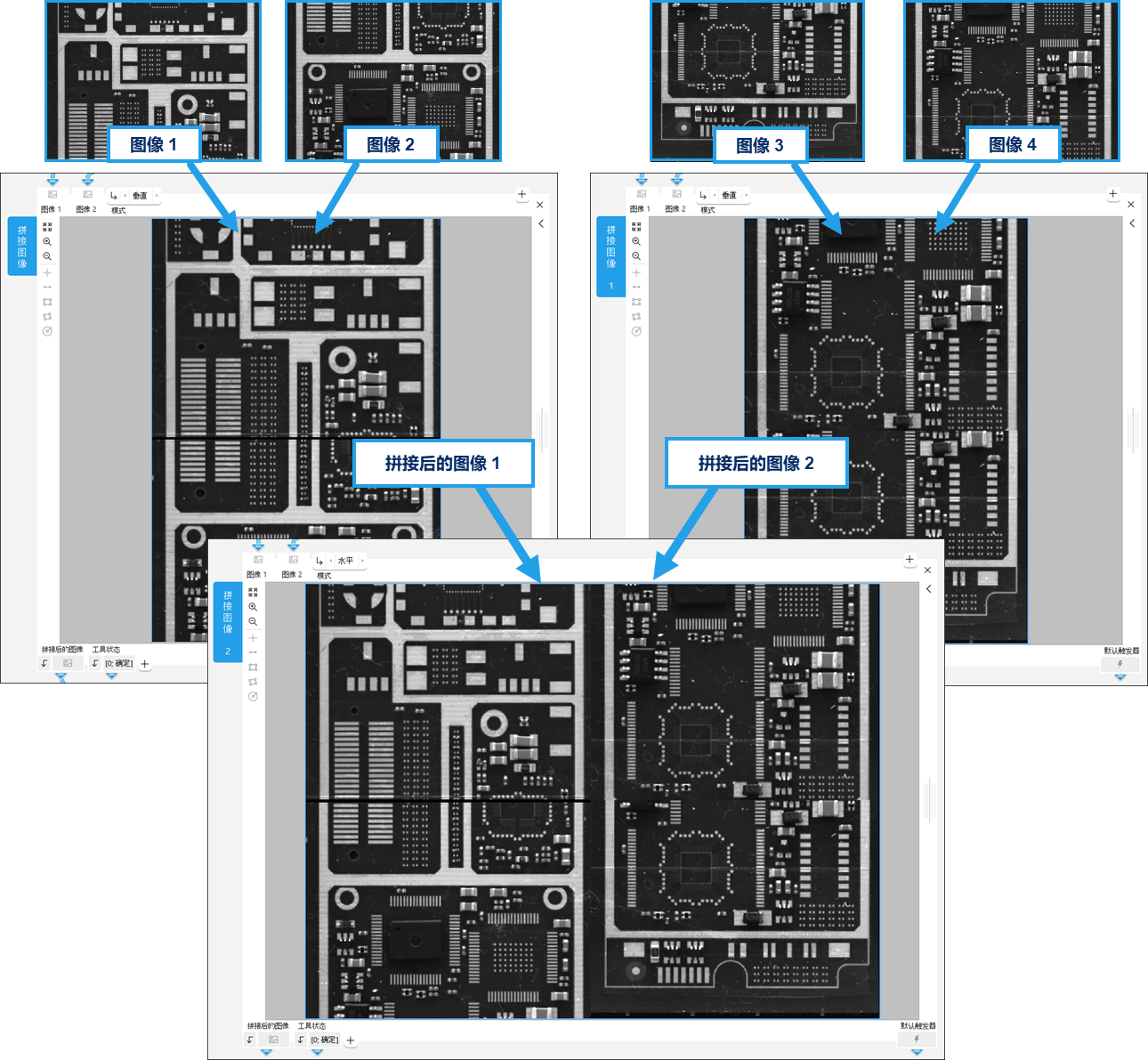 MERLIC 已通过新的概念工具“拼接图像”得到扩展。它可以让您将两张具有相同通道数量的图像拼接成一张图像。图像可以水平或垂直拼接。如果需要,您可以多次使用该工具,进而基于一系列拼接图像创建一张图像。结合采集序列,您可以将从线扫描相机或区域扫描相机采集的图像合并在一起。