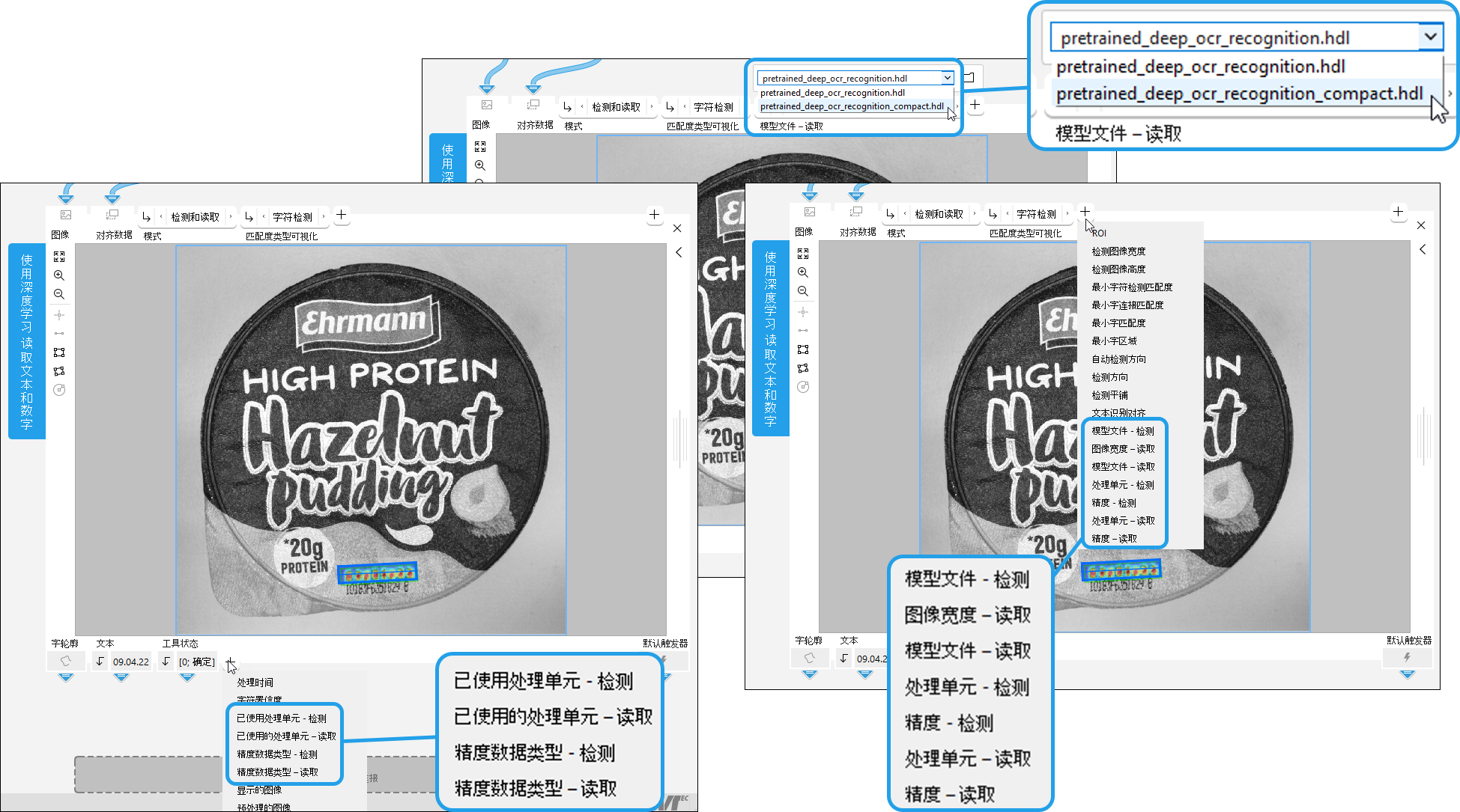 MERLIC 工具“使用深度学习读取文本和数字”在多个方面得到了改进。通过新增一个用于读取模式的深度学习模型,对其进行了扩展。新模型文件“pretrained_deep_ocr_reading_compact.hdl”更为紧凑,若时间和内存对您至关重要,则可使用此文件。