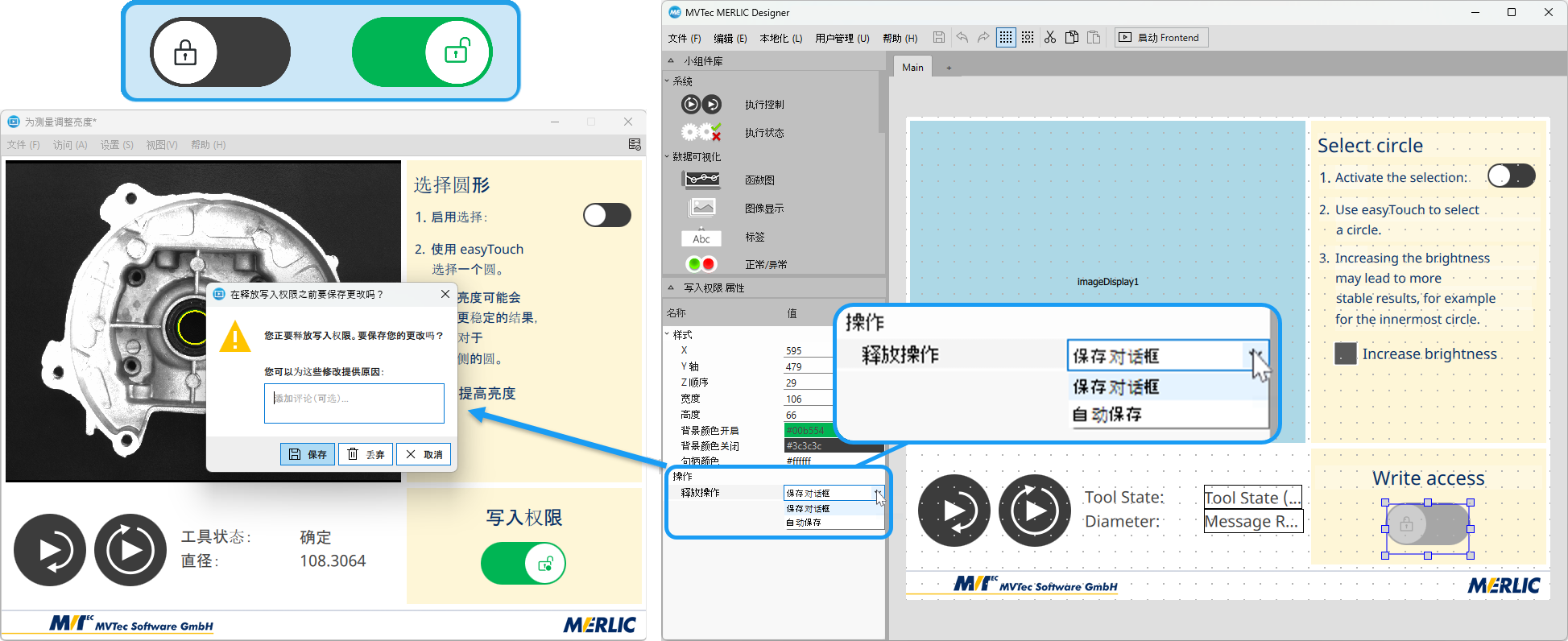 “写入权限”小组件的配置选项也得到了扩展。在为 MVApp 创建 Frontend 设计时,现在可以选择所谓的释放操作,该操作会在释放 Frontend 写入权限但仍有未保存的更改时触发。您可以选择自动保存更改,或者显示保存对话框,其允许 Frontend 用户放弃更改或指定更改原因。结合用户管理功能,还可以配置多个具有不同释放操作的“写入权限”小组件,例如为具有不同授权权限的用户在不同的视图上配置这些小组件。