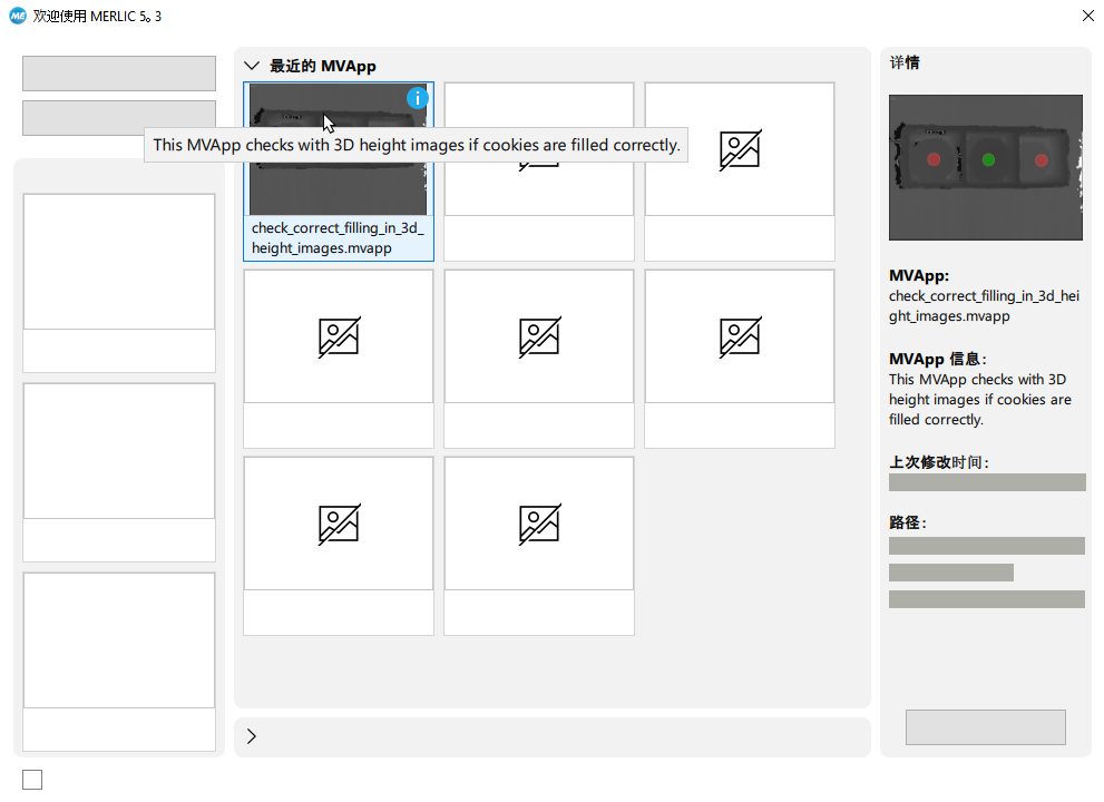 在启动对话框的“最近的 MVApp”区域中,您可以看到最近使用的 MVApps。单击“最近的 MVApp”区域中的 MVApp 可访问其右侧“详情”区域中的更多信息。启动对话框中会自动提供有关您的 MVApps 的一些信息,即其名称、上次编辑时间以及目录路径。但是,有两个元素需要手动定义才能显示:MVApp 预览图像 和 MVApp 信息。